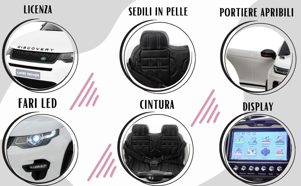Il SUV è la fedele riproduzione dell'originale della LAND ROVER. Spazioso e sicuro anche nella versione per bambini il fuoristrada DISCOVERY dispone di molti optionals tra i quali il PARENTAL CONTROL per controllare il tuo bambino anche a distanza con freno istantaneo, il lettore Mp3 per poter ascoltare la musica che preferite e il nuovissimo display da 4" per MP4, oltre a luci e suoni realistici per rendere la sua prima esperienza di guida il più divertente possibile.