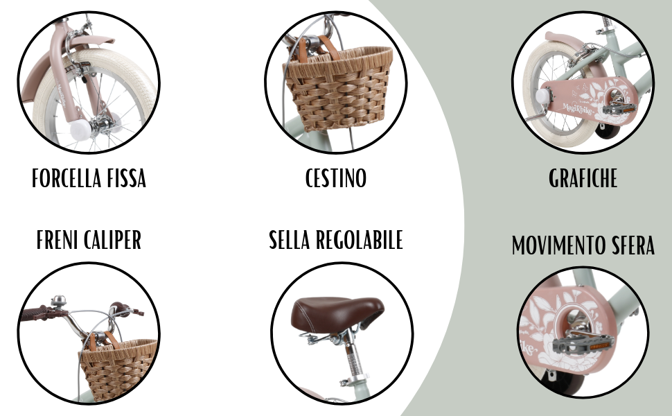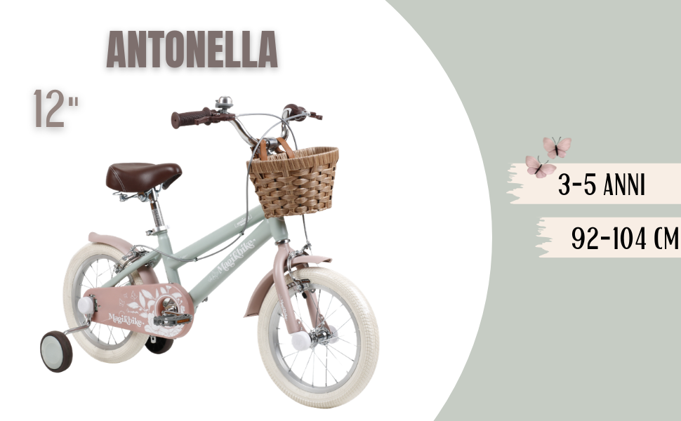 La MagikBike Antonella è una bicicletta da bambina dal design elegante e retrò, pensata per accompagnare le più piccole nelle loro prime avventure su due ruote. Grazie alla sua struttura robusta e agli accessori inclusi, offre sicurezza, stabilità e tanto divertimento durante le prime pedalate. Il suo stile classico con cestino anteriore la rende perfetta per passeggiate al parco o in città.