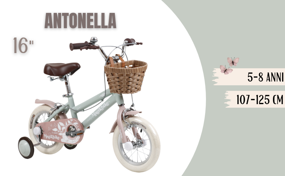 La bicicletta Antonella è disponibile con ruote da 12", 14", 16" e 20", per adattarsi perfettamente all’altezza e all’età della bambina.
