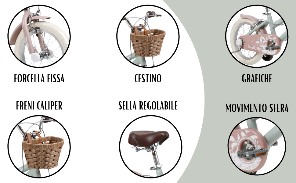 La MagikBike Antonella è una bicicletta da bambina dal design elegante e retrò, pensata per accompagnare le più piccole nelle loro prime avventure su due ruote. Grazie alla sua struttura robusta e agli accessori inclusi, offre sicurezza, stabilità e tanto divertimento durante le prime pedalate. Il suo stile classico con cestino anteriore la rende perfetta per passeggiate al parco o in città.