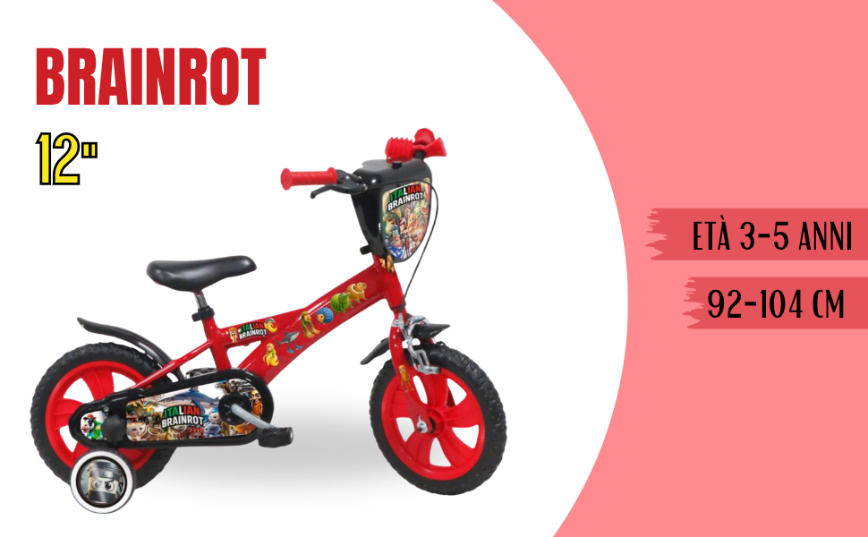 La bicicletta Brainrot da 12" è perfetta per bambini dai 3 ai 5 anni. Dotata di ruote in nylon con pneumatici EVA antiforatura, freno anteriore e ruota posteriore fissa per una maggiore sicurezza durante l’uso.