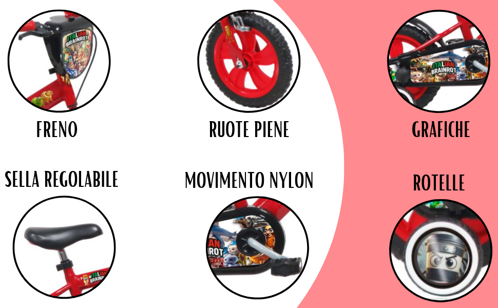 Sella e manubrio sono regolabili per adattarsi alla crescita del bambino. Inclusi anche stabilizzatori, trombetta e targa frontale con grafica Brainrot.