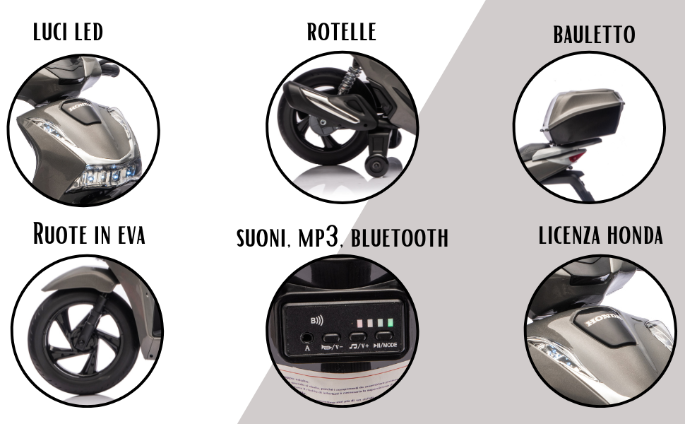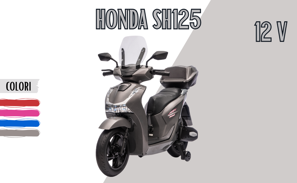 Riproduzione fedele dell'iconico scooter Honda SH125 in versione elettrica per bambini. Design realistico, materiali di qualità e funzioni pensate per il massimo divertimento in sicurezza. Perfetta per gioco in giardino o su superfici piane: il piccolo pilota si sentirà un vero centauro!