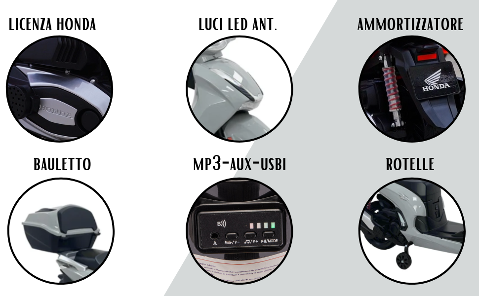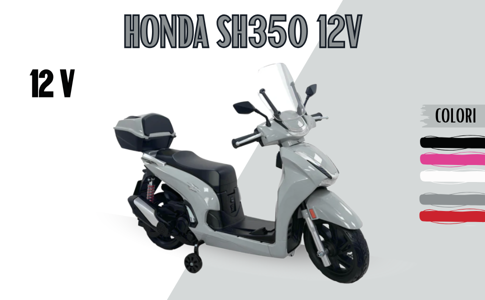 Lo scooter Honda SH350 12V porta l’icona delle due ruote nel mondo dei bambini. Con licenza ufficiale Honda, luci LED realistiche, suoni autentici e accelerazione a pedale, è il compagno perfetto per piccoli esploratori dai 2 ai 6 anni.